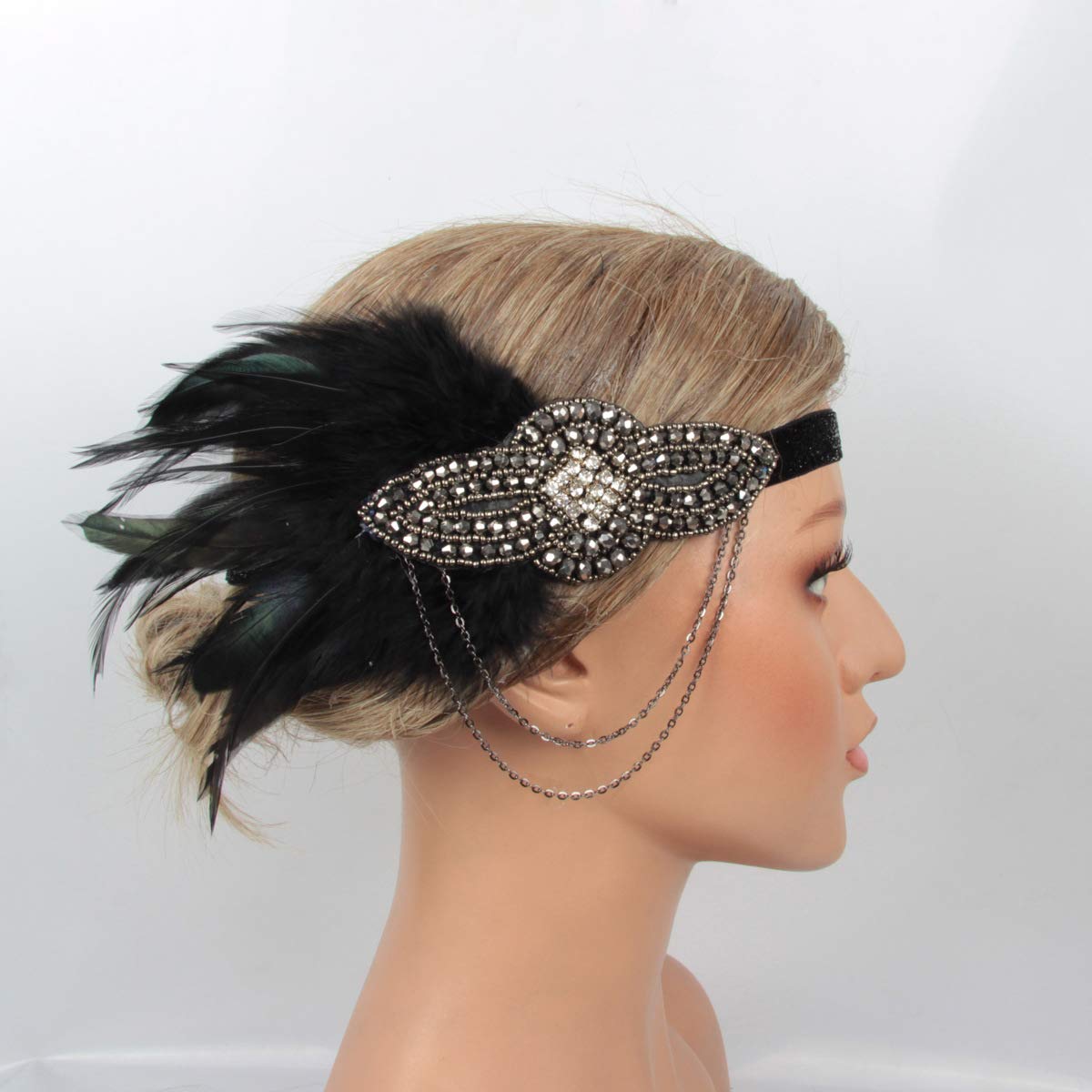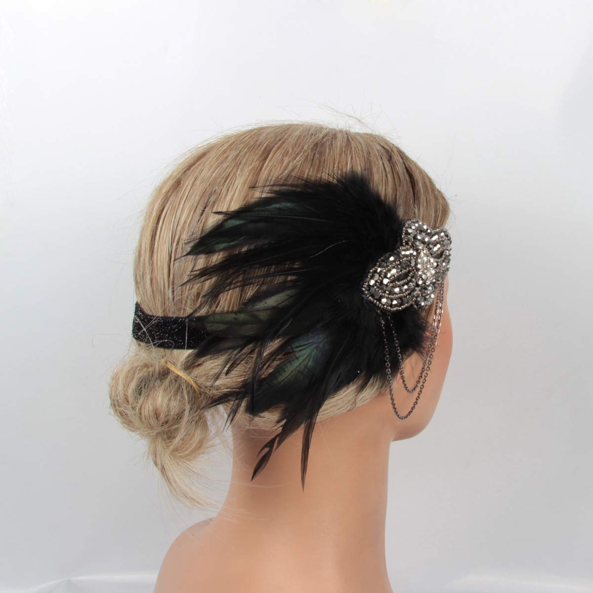 1920s Vintage Flapper Headband Great Gatsby 20s Showgirl Roaring Peacock Headpiece Black