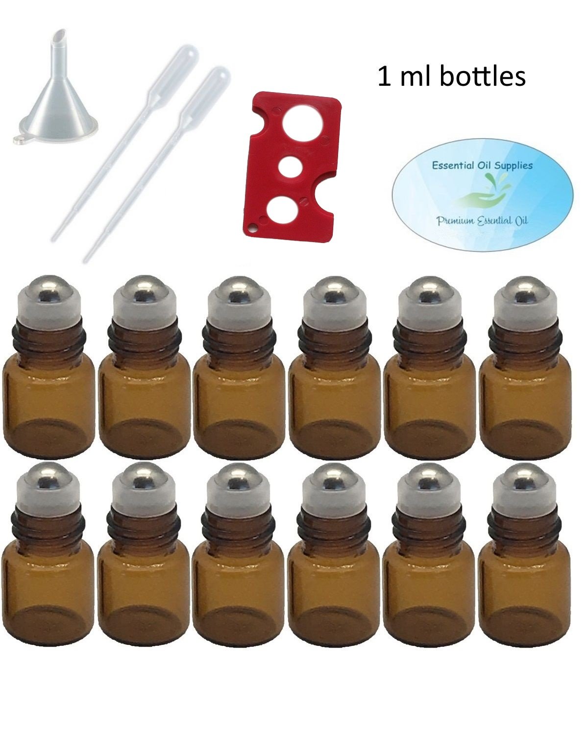- Comes with: 12 - 1ml (1/4 dram) Amber Roller bottles; 1 - Mini Funnel; 2 - .5ml Pipettes; 1 - Essential Oil Bottle Opener