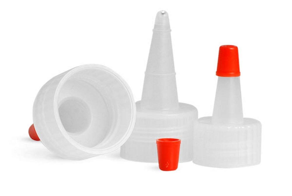 Versatile for many uses. Perfect for condiments, cleaning supplies, lotions, hair color, liquids, dish soaps, body soaps, inks, glues, paints, and modeling and craft activities. Round Cosmo shape bottles. PET plastic is BPA-free. Lightweight, great for travel and camping. The Yorker caps are designed to aid in the dispensing of the contents of the container through a hole at the end of the cone shaped cap. 2 ounce bottle neck finish is 20/410. 12 containers with Natural Red Tip Yorker Caps. Made in USA
