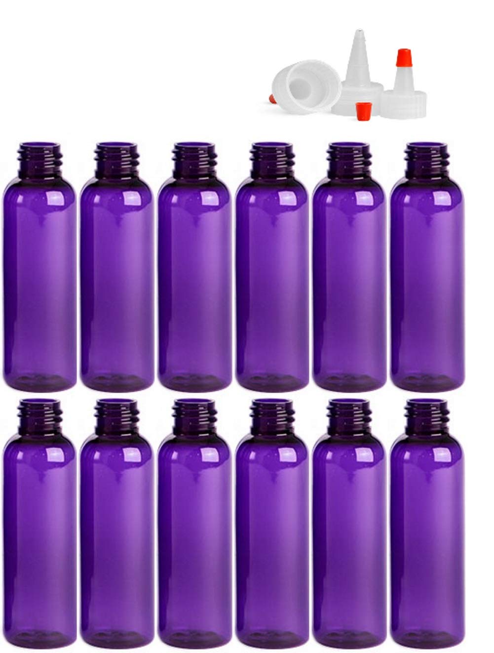 2 Ounce Cosmo Round Bottles, PET Plastic Empty Refillable BPA-Free, with Natural Red Tip Yorker Squeeze Spout Caps (Pack of 12) (Purple)