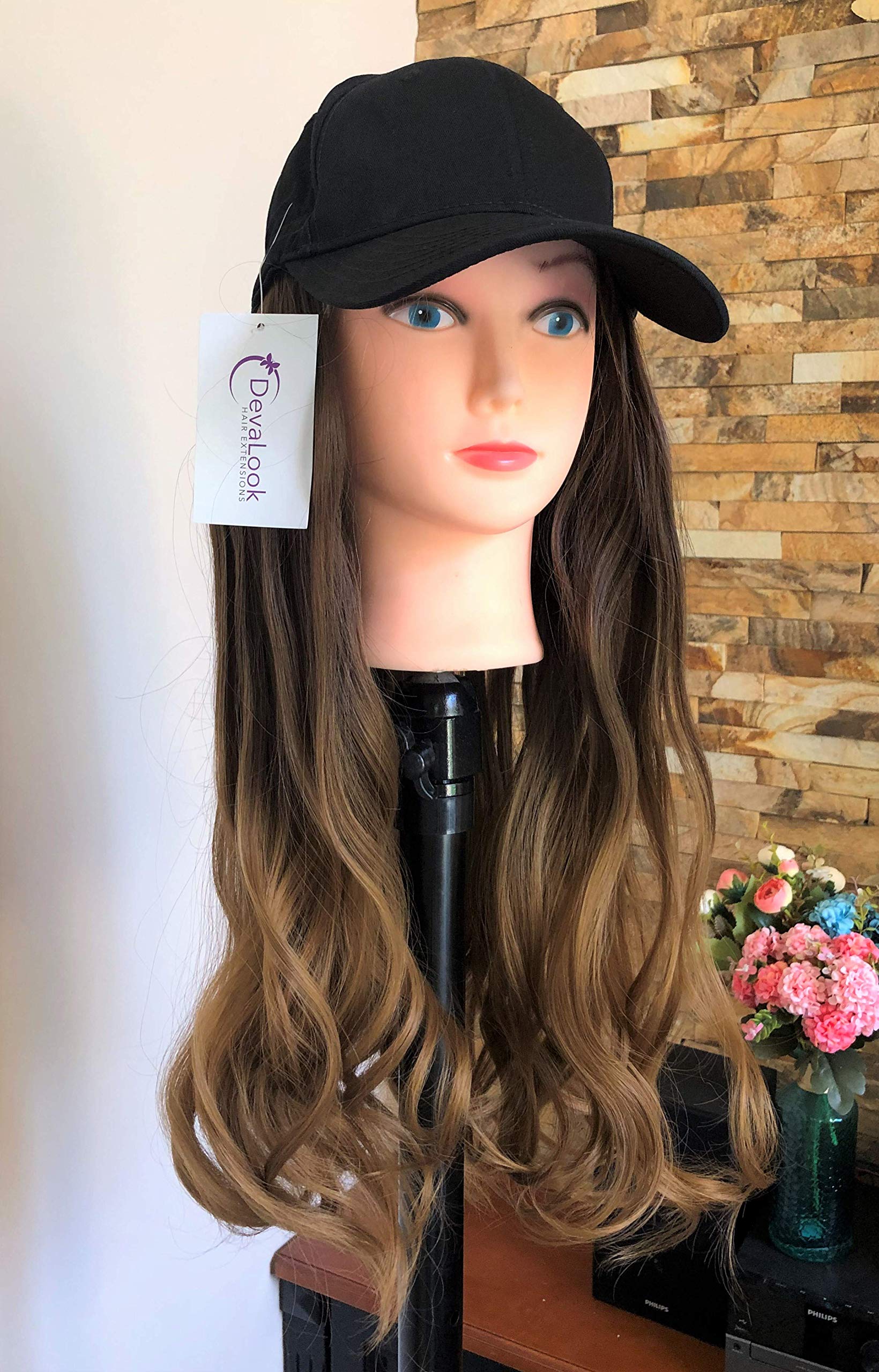 NOTE: GENUINE GOODS OF DEVALOOK HAIR EXTENSIONS ONLY SOLD BY SELLER LADYLOVESBEAUTY. Baseball Hat with Hair Extensions 1\. Hair Length: Straight 22inches, Wavy 20inches. 2\. Hair Weight: 280grams including hat. 3\. Hair Material: Synthetic fiber. 4\. Hair Color: Choose from drop-down menu. 5\. Package: 1 set * hat wig. 7\. Note: You cannot use heat on or dye these synthetic hair extensions, you can wash it in cold water. It is normal that few of the hair falls out for first-time use. 8\. Return policy: the item must be brand-new in its original package without being used if you need to return the item. Otherwise we hold the rights to refuse the return request.
