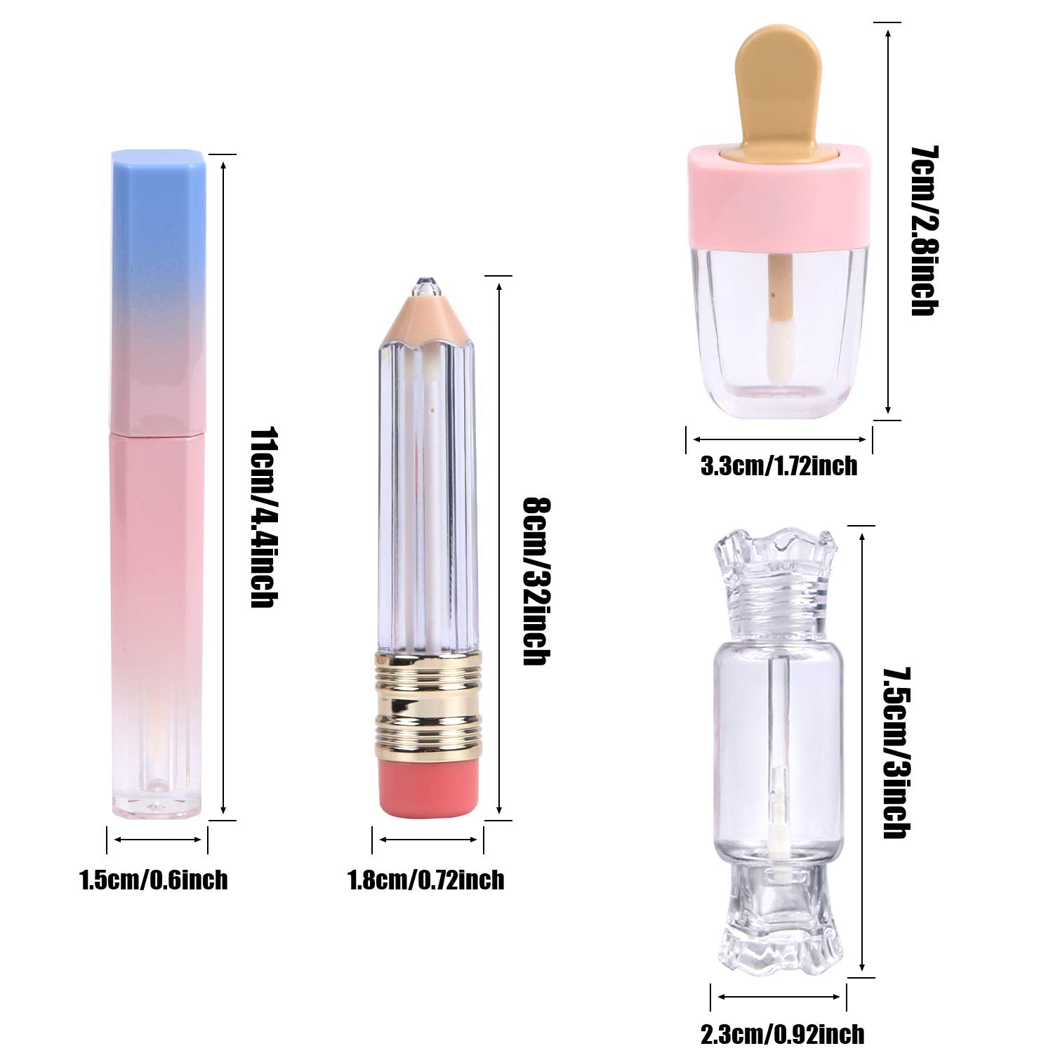 - 【Suitable Size】: The size of pencil shape lip balm bottle is 3.2 x 0.72inch / 8 x 1.8cm , the size of ice cream bottle is 2.8 x 1.32inch / 7 x 3.3cm, the size of candy bottle is 3 x 0.92inch / 7.5 x 2.3cm and the size of long bottle is 4.4 x 0.6inch / 11 x 1.5cm. The small size is convenient for you to carry and you can maintain your makeup at any time.