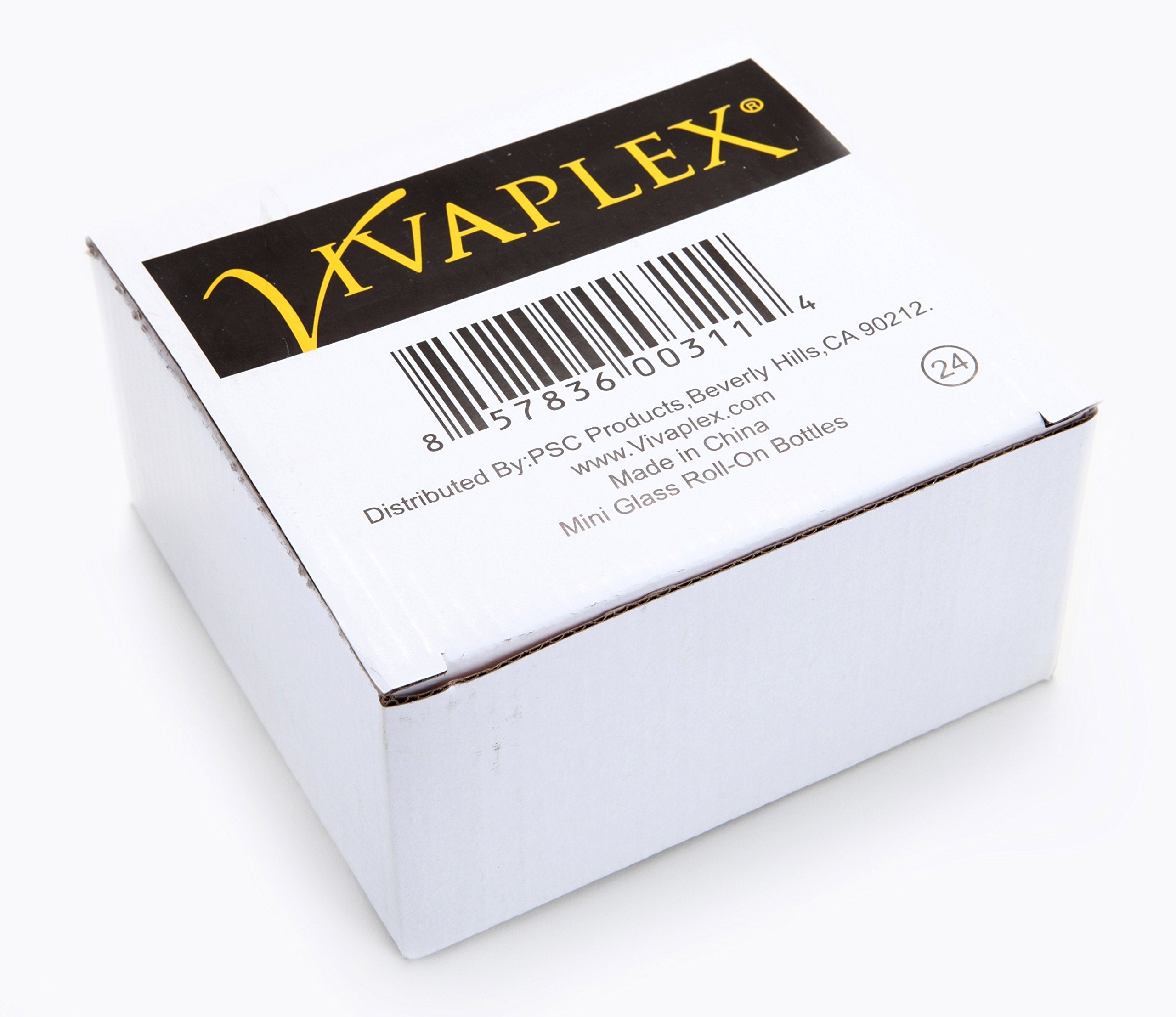 • 24 clear, glass, mini roll-on bottles with black caps.