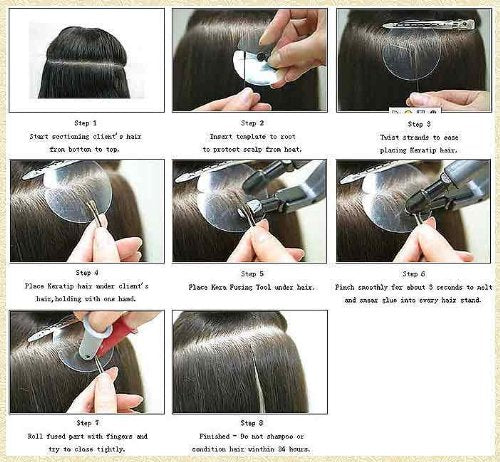 Each strand has approx 180 individual hairs that are bonded together on the ends by a keratin protein glue shape of Nail shape hair that is melted by a fusion iron or fusion iron or fusion heat wand which connected to individual section of your hair. Since these 100% human sleek hair has been cuticle aligned to ensure less tangling and durability , you can wash, dry and style just like your own hair. You may also curl, flat ironed or even color that hair. It can take anywhere from 150-250 strands for a full head of hair depending on how thick your own hair is. They last approx 3-4 months before they need to take out and redo again.NOTE: The body wave wavy texture will loosen once washed and will dry semi straight with body. You can use a curling iron or hot rollers for a few minutes and they will once again have beautiful waves with lots of bounce. Chemical process like coloring, tinting or perm can drastically change the surface of the hair, thus stressing it. You should only let authorized professional perform such services in order to get the most out of your extension hair.