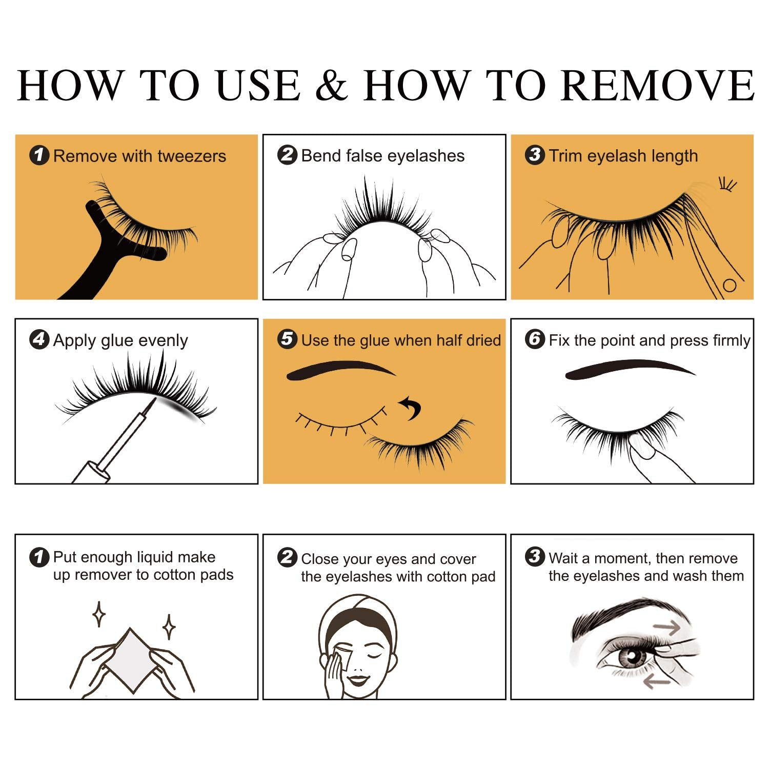 - 【APPLICATIONS】:Trim the false eyelashes to fit your eyes, then apply adhesive to the eyelashes' cotton stalks, at last gently press on the eyelash line until the false eyelashes are fixed