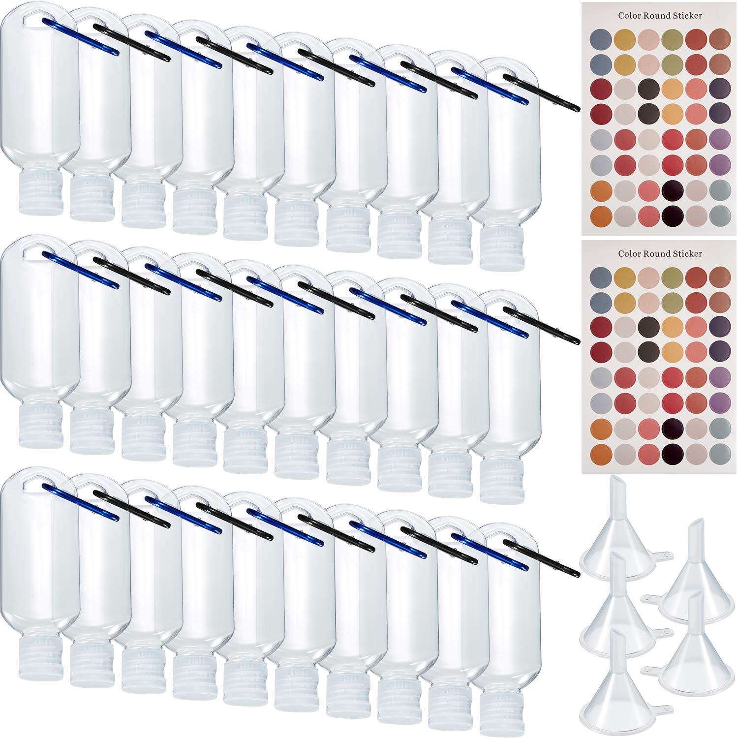 30 Pieces Empty Plastic Keychain Bottles Travel Leakproof Bottles Containers Flip Cap Small Refillable Bottles for Toiletry Shampoo Lotion with 96 Pieces Stickers and 5 Pieces Funnels, 50 ml