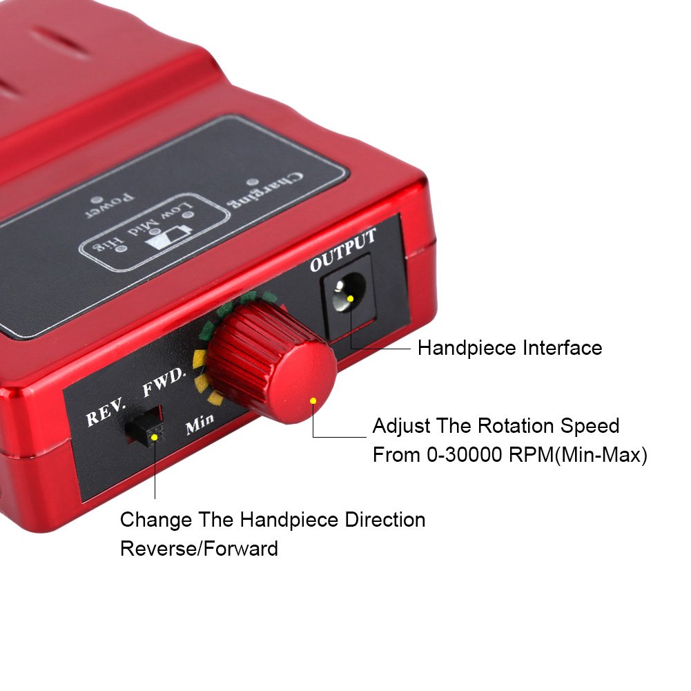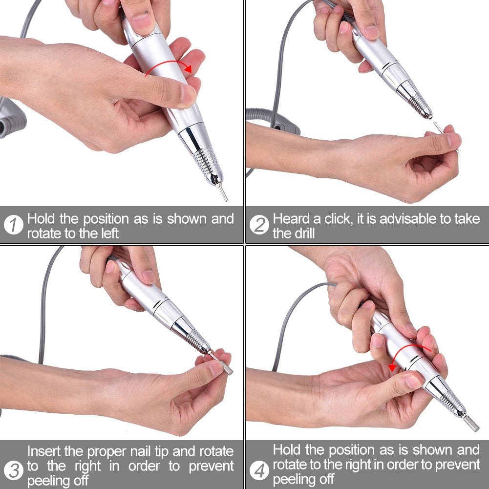 - HOW TO OPERATE: nail drill has the button of "FWD-Forward" "REV-Reverse" function to change direction,for handpiece please rotate it from the white middle part,then the drill bits will be opened and then press the button white middle part, it will close the hole and will hold the bits tightly