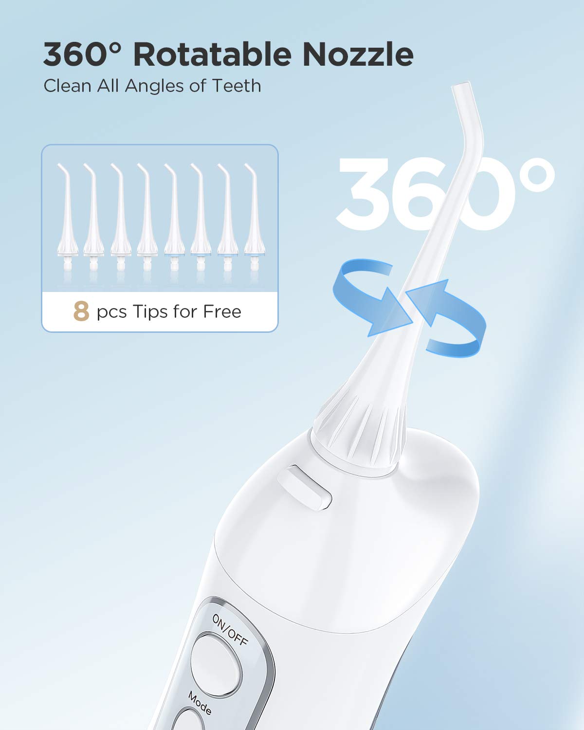 - 【8 PCS 360° Rotatable Water Jet Tips】Come with 8pcs tips for free to replace or use with family. (SUGGESTION: To Keep Hygiene, it's recommended to replace the nozzle 3 month). 360° rotatable nozzle design allows you to easily clean the interior side that are difficult to reach and prevents debris and dental plaque.