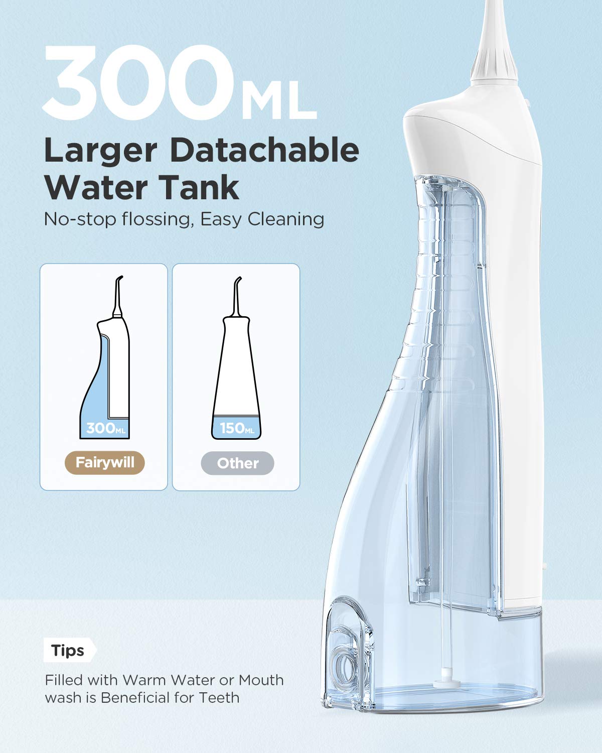 - 【300ML Detachable Water Tank & IPX7 Waterproof】300ML large water tank provides enough and uninterrupted oral dental flossing. Avoid Adding water continually. With double-sealing rings, Fairywill oral irrigator prevent water leakage reliably, can use for shower in the bathroom and it's washable to clean.