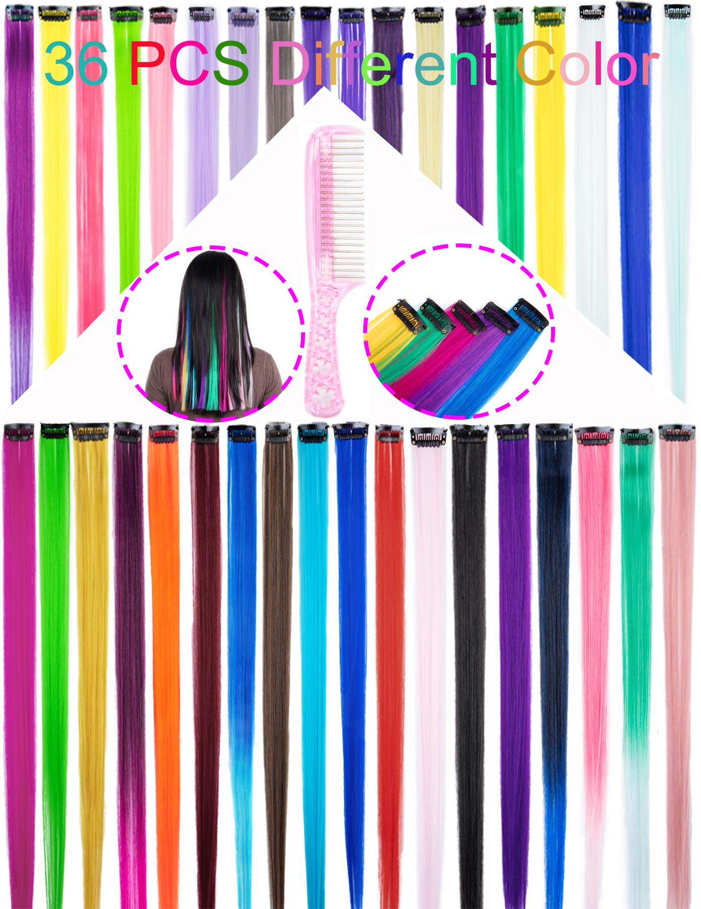 • HAIR DETAILS --Package: 36 PCS Different Colors.Approx 22 Inches-Straight; 100% High Quality Synthetic Fiber with a snap clip. It looks, moves and feels like real hair with affordable price.