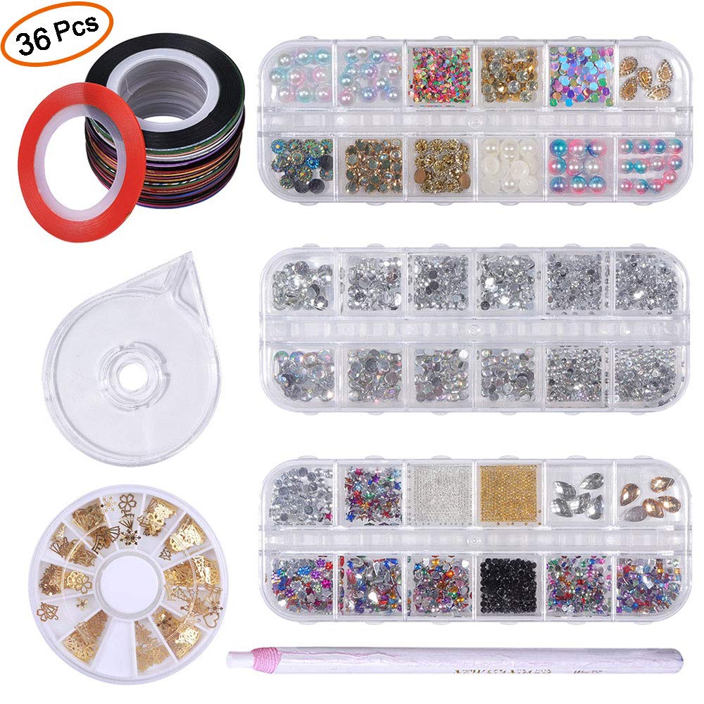 36Pcs Nail Art Decoration Kit, Nail Rhinestones Set Multi-size Jewels Metal Nail Rivets Studs Colorful Nail Art Supplies, Nail Art Striping Tape & Striping Roller Box