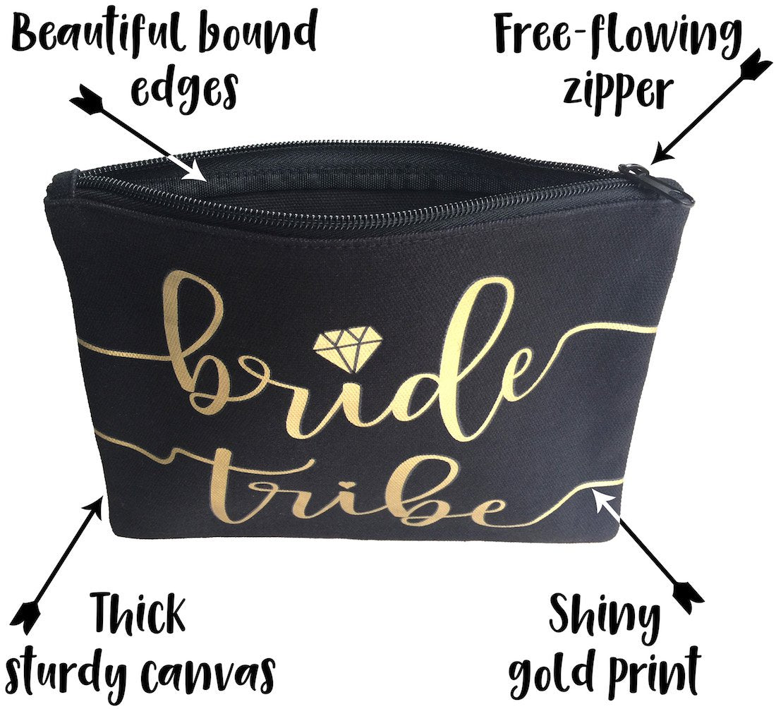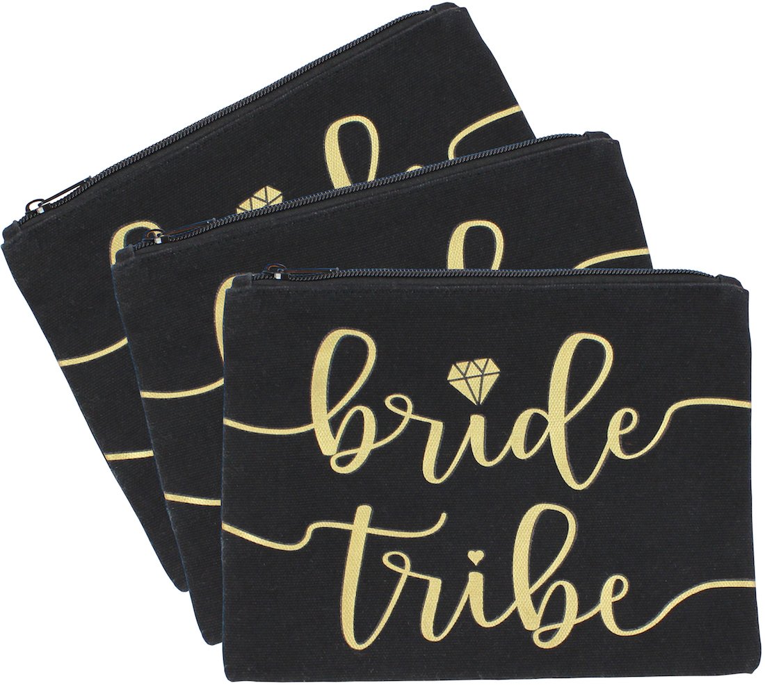 3pc Bride Tribe Makeup Bags - Bridesmaid Favor for Bachelorette Party, Bridal Shower, Wedding. Also Great as Toiletry Bag, Wedding Survival Kit, Hangover Kit, Keepsake (3pc Pack, Black & Gold)