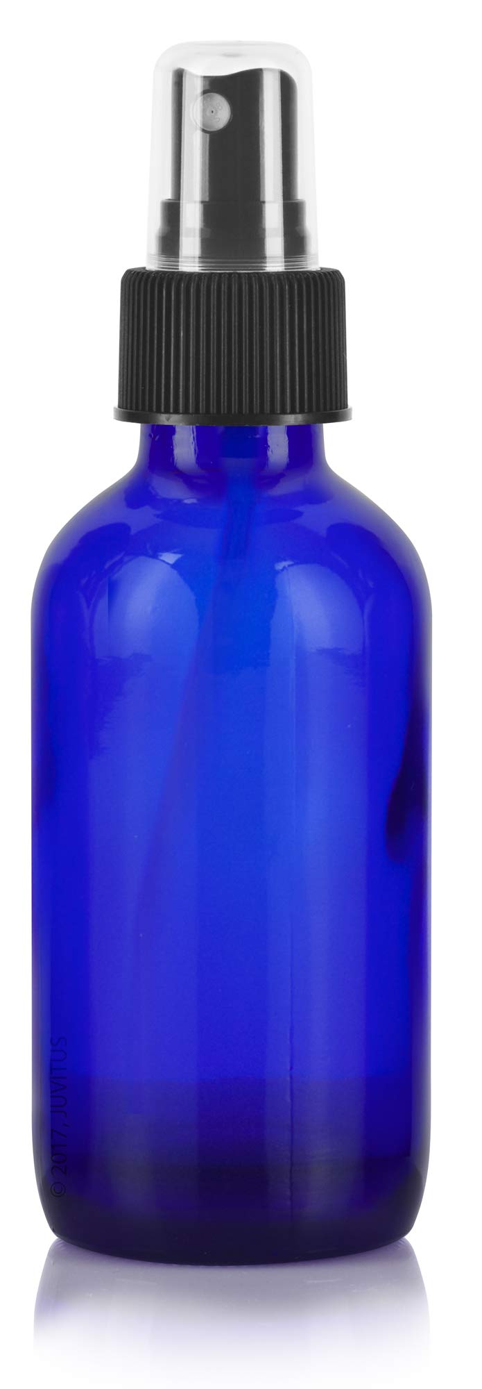 4 oz Cobalt Blue Glass Boston Round Fine Mist Spray Bottle (8 Pack) + Funnel by JUVITUS Store