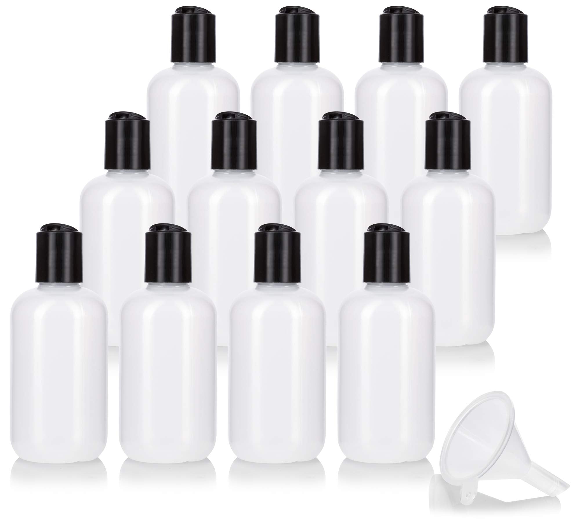 4 oz/120 ml Clear Natural Squeeze LDPE Plastic Bottle with Black Disc Cap (12 Pack) + Funnel
