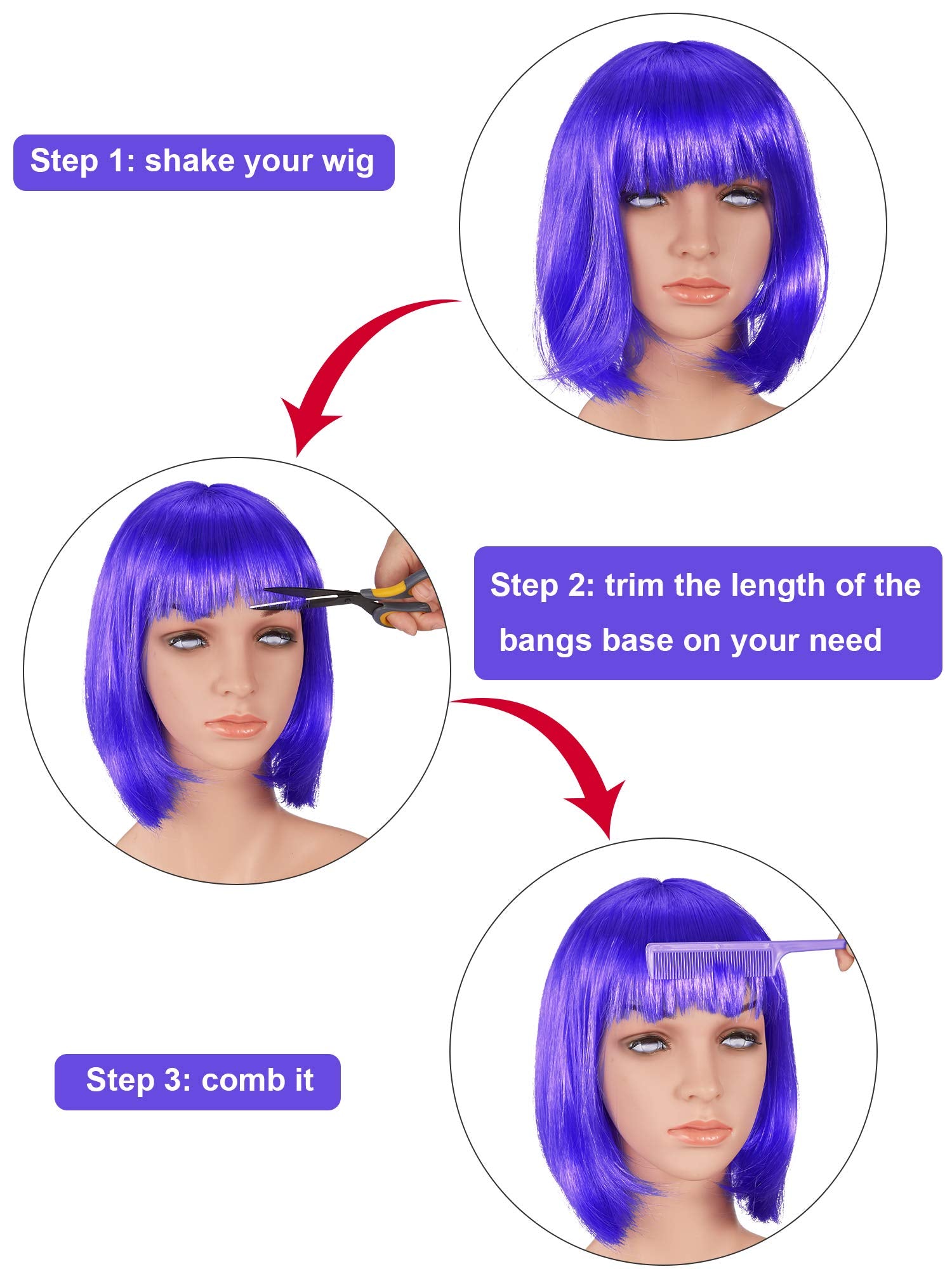 - Durable material: these yellow, red, blue, purple bob wigs are made of polyethylene, which is durable and comfortable, they will not hurt your hair easily, you can wear them with confidence