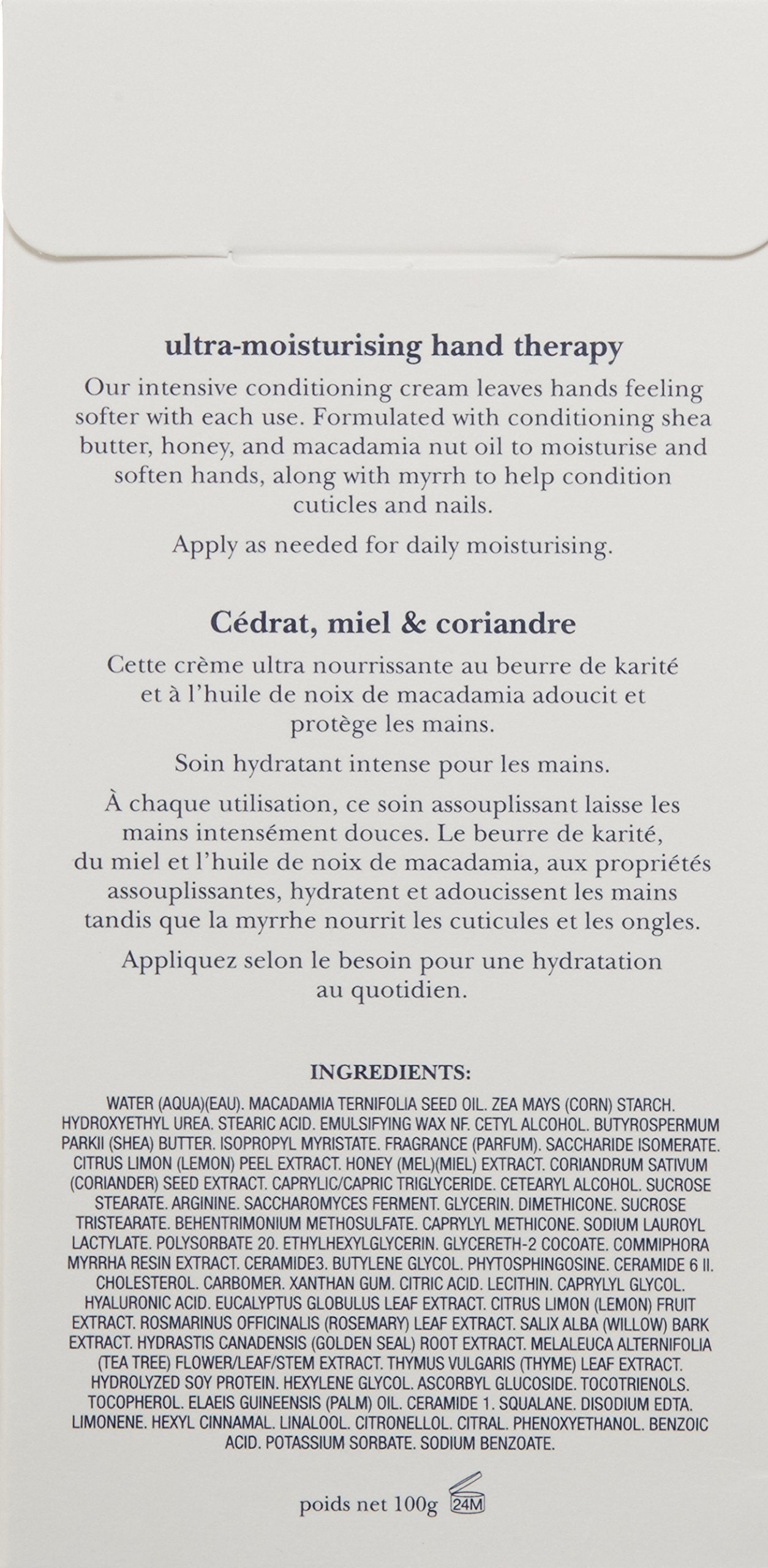 Lock in lashings of moisture with our award-winning Citron, Honey & Coriander Hand Therapy. Infused with macadamia nut oil, shea butter and conditioning lemon, coriander and honey extracts, this intensive cream nourishes skin so it's noticeably smoother after each luxurious application.