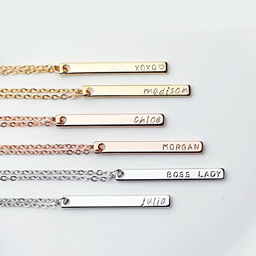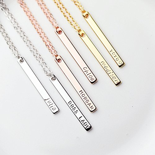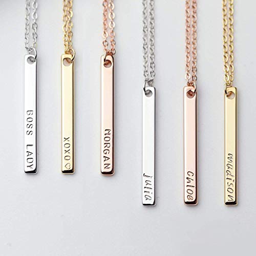 Details: ♥ Enter your personalization requests on the 'options' menu ♥ Enhance your style with this dainty name bar necklace. Its thin and elegant name plate charm hangs vertically from a delicate chain, highlighting the radiant simplicity of the piece. A hand stamped name, initials, or short message makes this necklace a special, meaningful gift the wearer is sure to treasure. Perfect for weddings, birthdays, and other special occasions. Order one for a significant other, or personalize one as a treat for yourself. If you so choose, both sides of the plate can be stamped, as well. In order to extend the life of this plated piece, remove jewelry when sleeping, exercising, or doing other physically strenuous activities, as prolonged contact with sweat will cause the plating to wear away faster. In addition, avoid contact with perfumes, water, body oils, and other chemicals, including household cleaners. Never use chemical jewelry cleaners as these will wear away at the plating and do more harm than good. For light cleaning, gently polish with a soft, lint-free cloth in order to avoid scratching. Store in a cool dry place. It is highly advised to wear solid gold or sterling silver jewelry if one has sensitive skin. Personalized Necklace Bridesmaid gift Mother's day gift for women Graduation