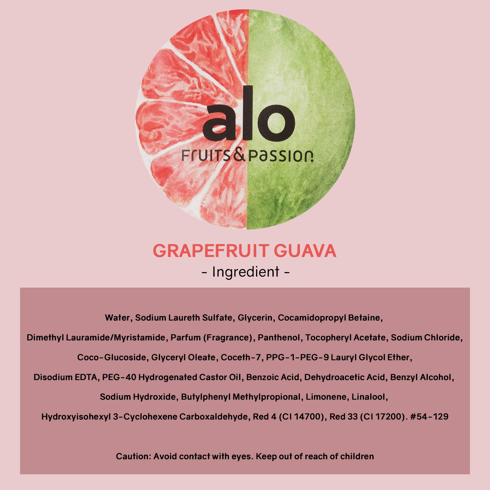 ALO! There are many ways to say Hello but ALO is the greeting from the beautiful Caribbean for a warm welcome to the scent of exotic fruits and flora, which captures the vibe of tropical islands. ALO is the new bodycare line from Fruits & Passion that embodies the passion and the sunshine of the Caribbean fruits. The revitalizing essence of the tropical fruit share its spirit and vitality. ALO carries from soaps to body wash with a wide variety of enticing fragrances to meet all your senses. Revitalizes and lifts your spirit from the everyday stress and fatigue with ALO line. **GRAPEFRUIT GUAVA** : The sparkling nergy of grapefruit and the smooth sweetness of guava fill your day with elegance of this luminous fragrance. **SHOWER GEL** : Take care of yourself and the environment with our biodegradable shower gel. Its gentle cleansing formula is enriched with vitamins E and B5, known for their hydrating and antioxidant properties. Product made in Canada