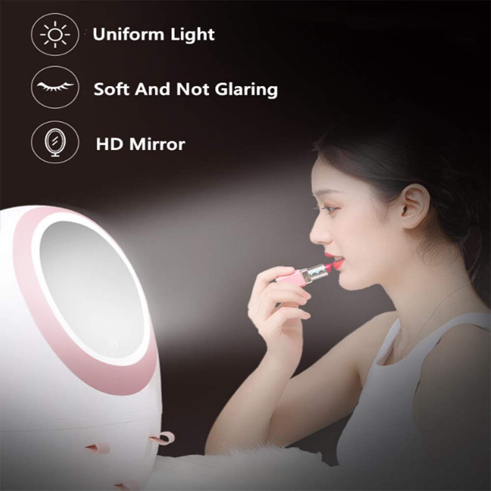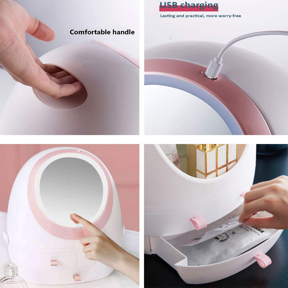 **Zinnor Makeup Mirror Organizer with Light helps you make life more easier and enjoyable.** **▶Item Features** ☑ Wonderful makeup organizer with LED mirror, saving your desk space, and well organize your make-up and dresser. Cosmetic caddy shelf overall. ☑ High-definition makeup mirror, touch LED lights, 3 levels of adjustment, brightness as you like. ☑ No Need to assemble-elegant look-dust & water free-ample storage space. ☑ The cover desiged with 360 degree freely rotating, if don' t use, can be completely closed, the dust can't get in. ☑ 1 Large drawer, 2 middle drawers, can hold makeup brushes, lipsticks, nail polishes, eyeliners, large eye shadow palettes and other small everyday collection. **▶Technical Parameters** Item Type: LED Mirror Makeup Organizer Material: ABS + Glass Color: White + Pink Charging Method: USB charging Function: Cosmetic finishing with makeup mirror Storage Scene: Table, bathroom, bedroom or others you like Size: 11"(L) x 7.1"(W) x 13.8"(H)/28*18*35 cm **▶Package Includes** 1 X Lighted Vanity Mirror with Organizer 1 X USB Cable **✉ Any questions, we are all here in 24 hours for your service.**