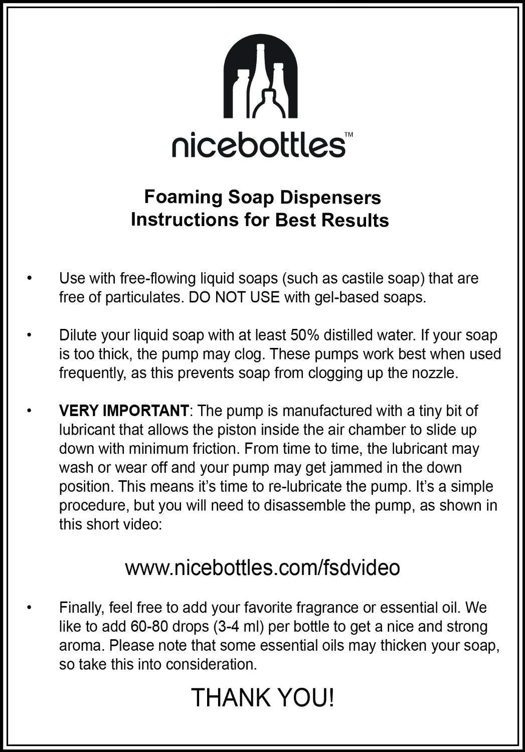 Your entire family will absolutely love these foaming soap dispensers. They work great with all the best brands of castile liquid soap, such as Dr. Bonner's, Vermont and and La Almona. Item includes one set of "Instructions for Best Results" by NiceBottles.