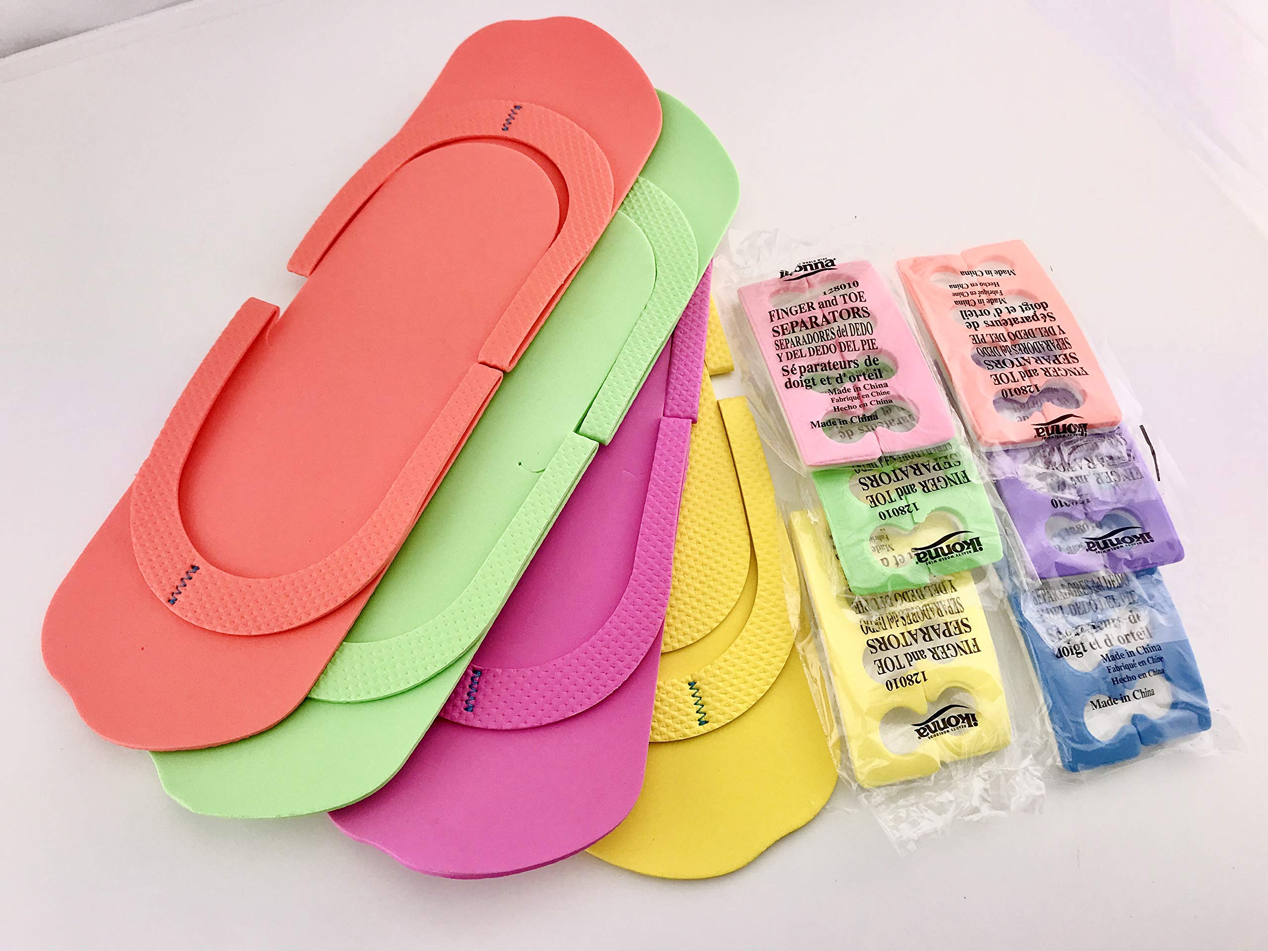 - Spa Disposable Foam Slippers (24 pairs) - Two Toned Color Toes Spacers (24 pairs) - Made of foam, very comfortable and Flexible while using those nail art tool. - ASSORTED COLORS meaning that the color of the items are randomly selected, might be different from pictures. Brand: N.E.I Package...