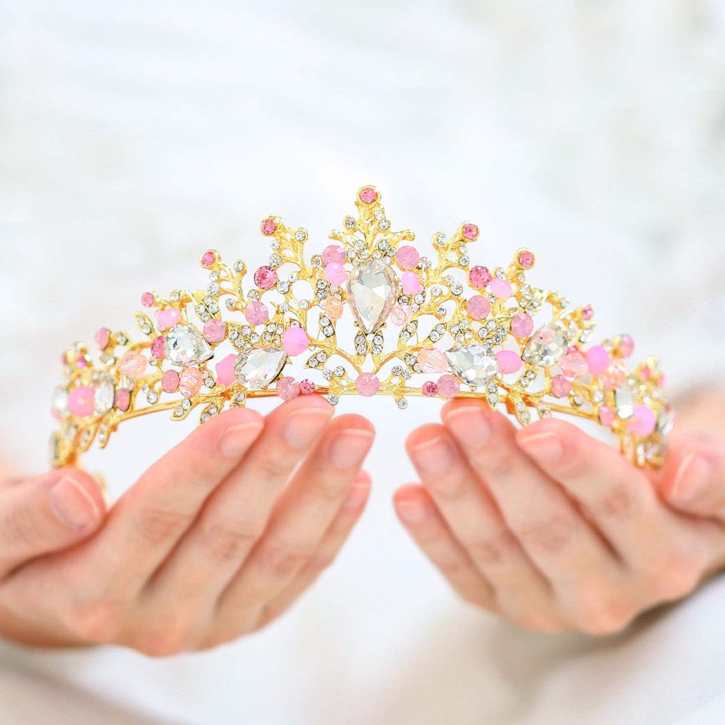 Bridal tiaras is made by alloy,rhinestone,crystal and opal.Good color retention, not easy to fade. Festival hair pieces approx. 2.5 inches in height,6 inches in diameter.You can bend it to larger size.Solide construction will not be damaged. Perfect hair accessories for wedding shower, Party, prom custume and any special occasions. Gold...