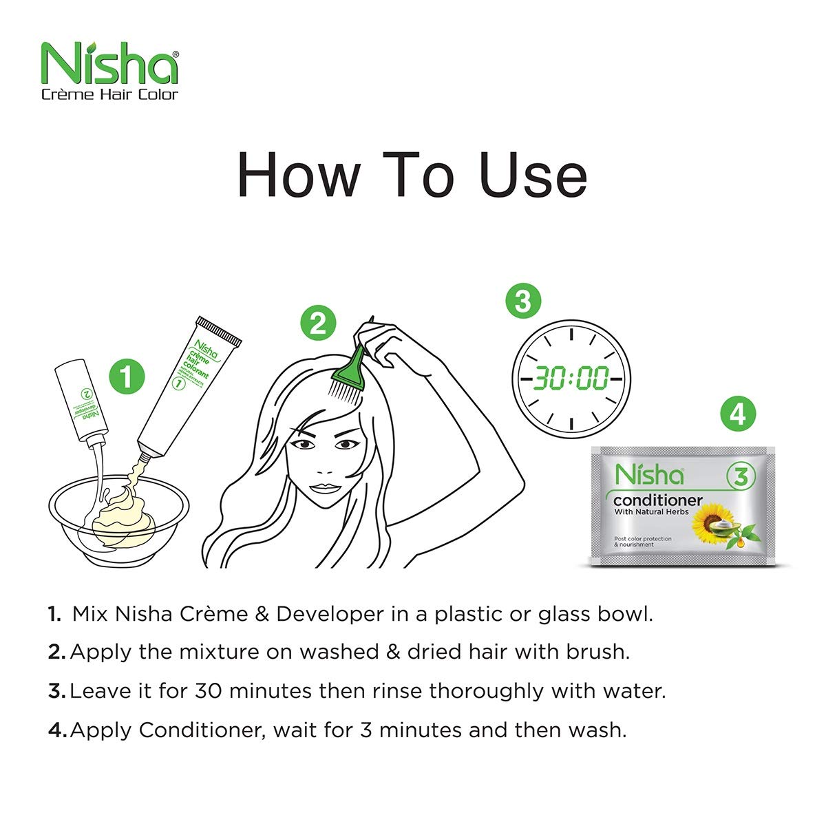- Package includes- Nisha 60mlx3 Developer Bottle, Nisha 60gmx3 hair colorant Tube, 3x3 sachets of 6ml Conditioner, 3 pair hand gloves, 3 brush and 3 instruction leaflet for home use.
