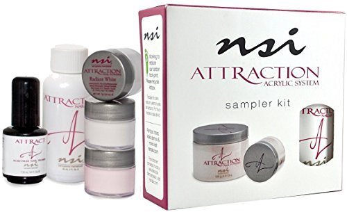 nsi Attraction Nail Acrylic System Sampler Kit (Attraction Nail Liquid,Radiant Pink+White+Totally Clear Nail Powder,Attract (Acid-Free) Primer)
