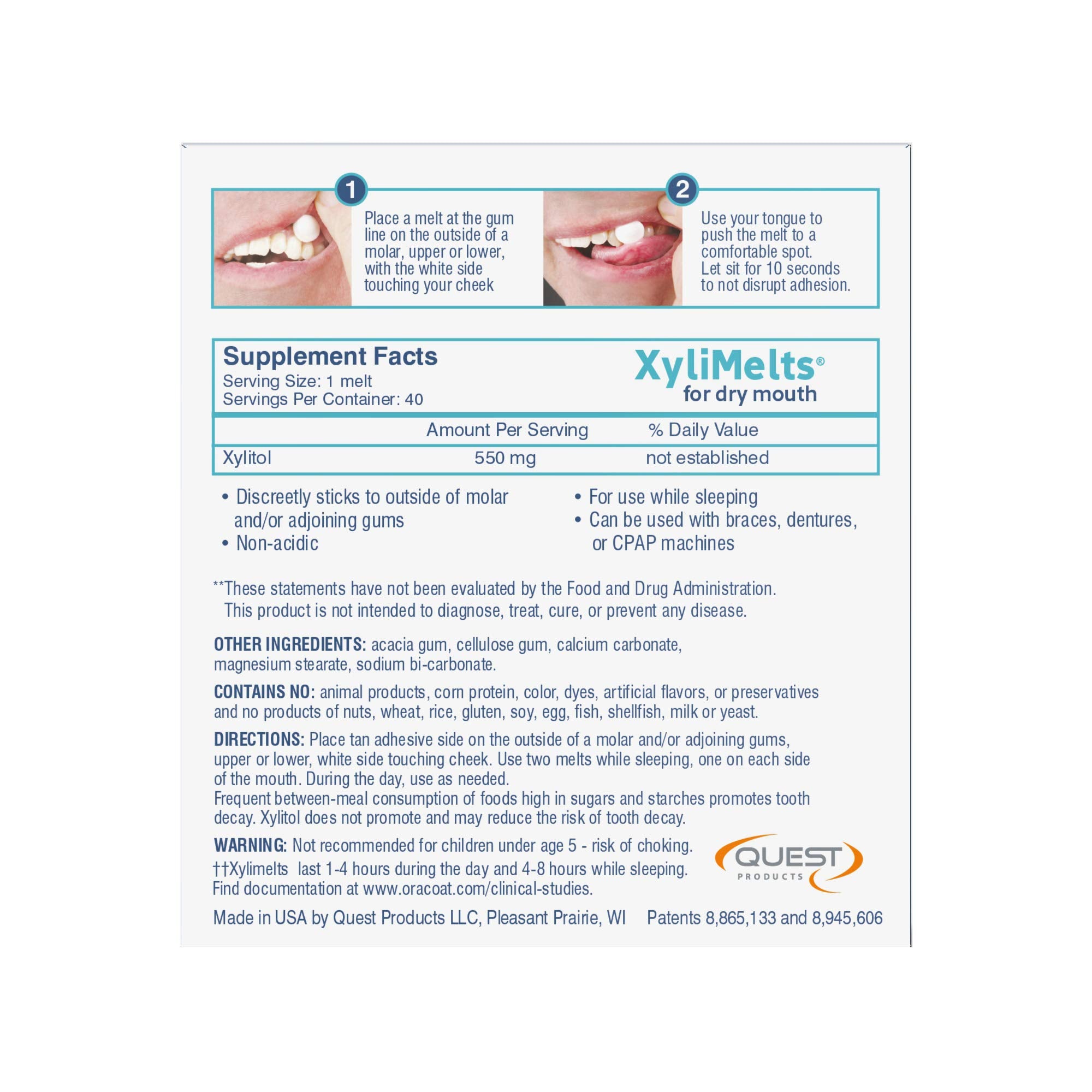 Lasts for hours The actual product may be different than product image Brand: Oracoat Buy Packs and Save - XyliMelts is the best solution for Dry Mouth (xerostomia). Increasing saliva, XyliMelts also moisturizes the mouth and coats it in a soothing oral lubricant to keep your mouth comfortable for hours....