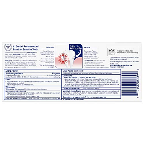 Details: Sensodyne Fresh Mint Sensitive Toothpaste is a cavity prevention and sensitive teeth treatment that provides relief and lasting sensitivity protection, with a mint flavor that keeps your mouth feeling fresh and clean. This potassium nitrate and sodium fluoride toothpaste builds 24/7 protection against sensitivity by protecting exposed areas of dentin and working deep inside the tooth to calm the nerves. With twice daily brushing, this SLS free toothpaste delivers the same cavity protection benefits of regular anticavity toothpaste, for healthy teeth and fresh breath. Available in a convenient 2 pack, this toothpaste for sensitive teeth keeps you stocked for longer. For best results, brush for two minutes, twice daily. Get lasting protection from tooth sensitivity with Sensodyne.