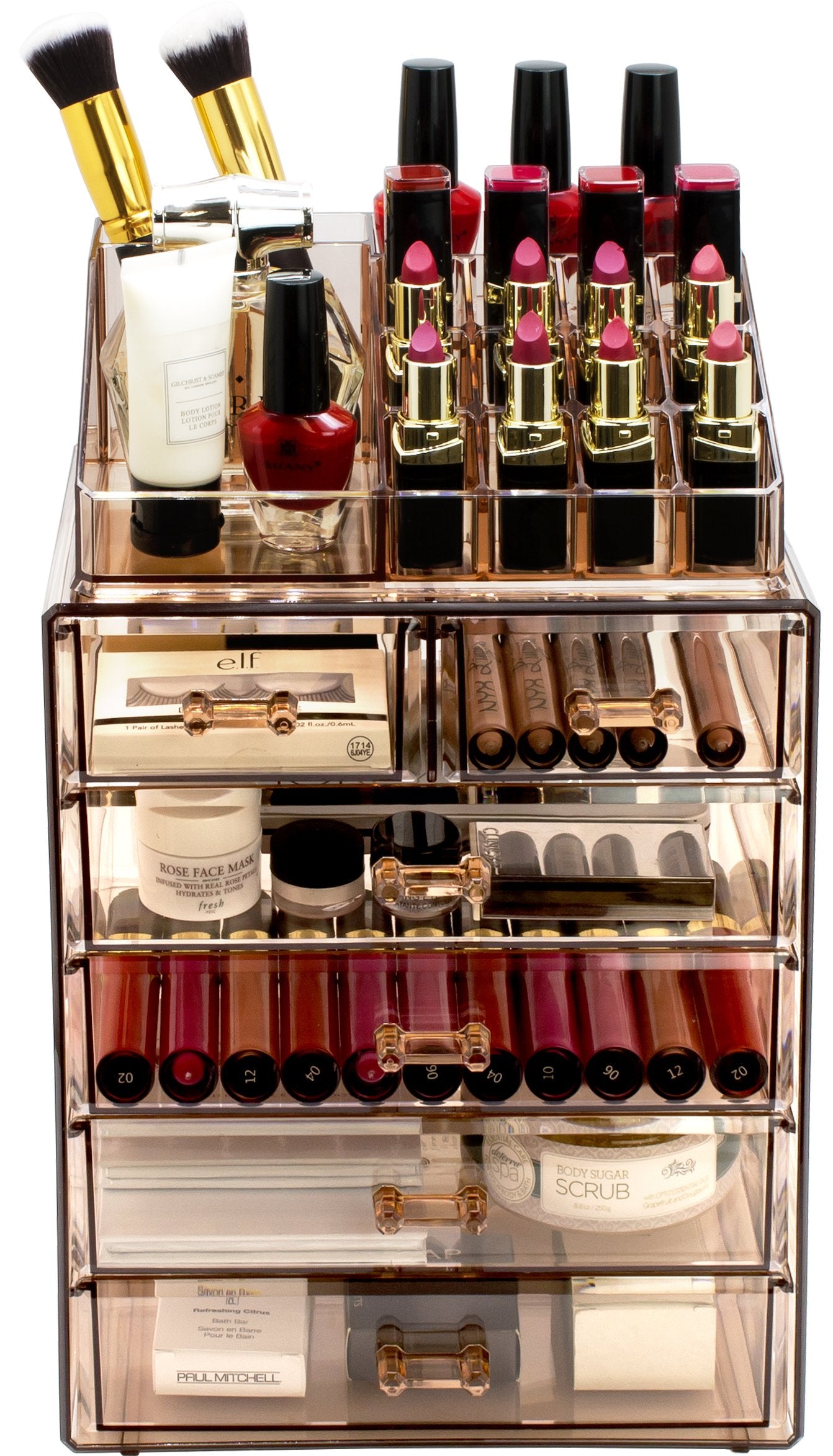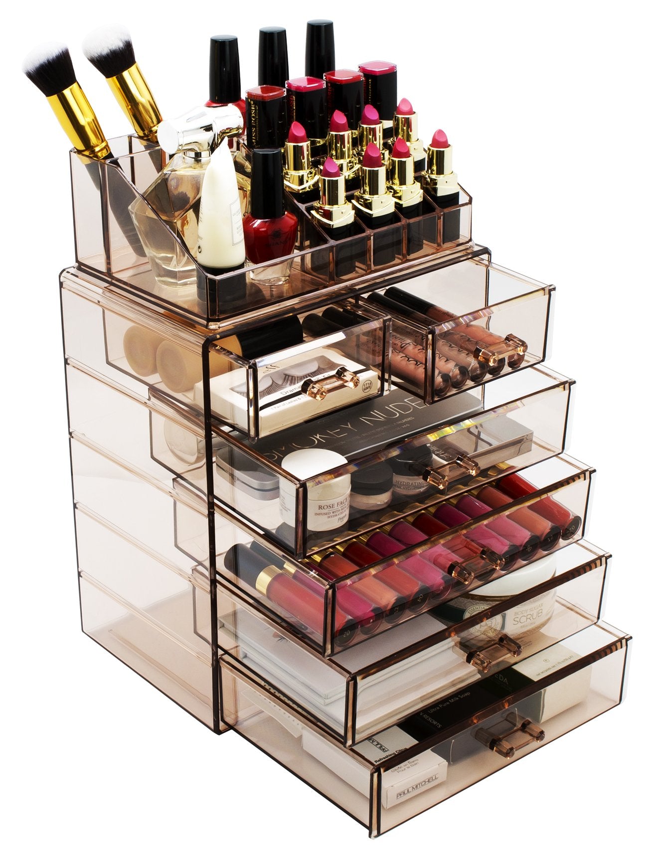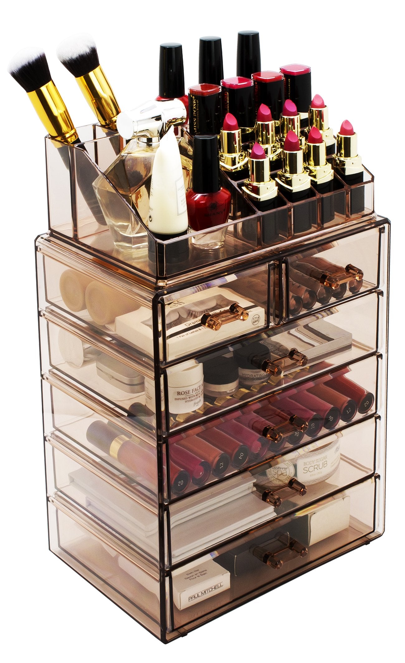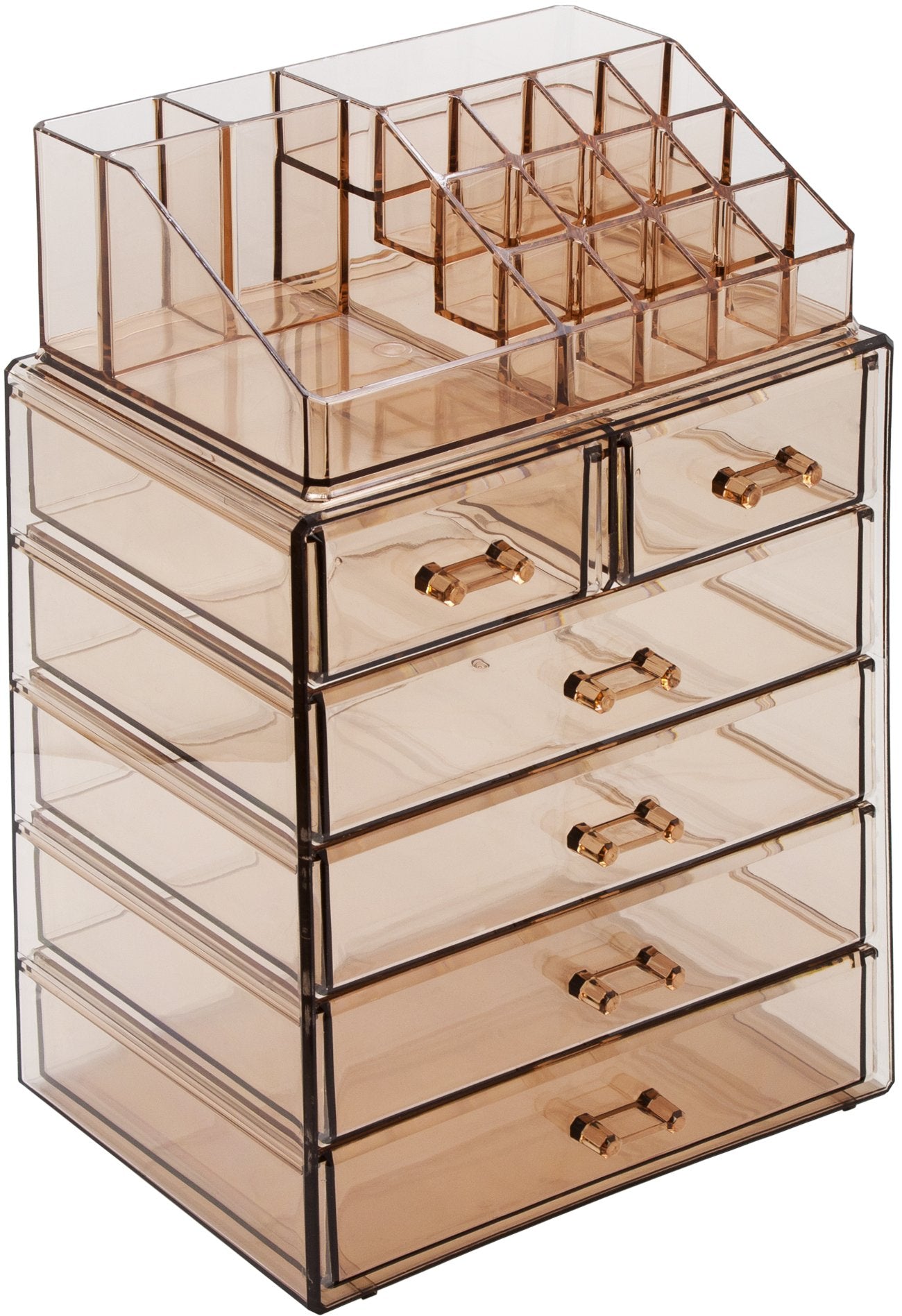 **Tired of rummaging through dresser drawers, purses, and bags to find your favorite go-to items?** Find beauty in organization with the Sorbus Acrylic Cosmetic Makeup and Jewelry Storage Case. It features acrylic construction to store your makeup and jewelry with an effortless view. Four drawers on the bottom unit are ideal for oversize cosmetics, toiletries, and grooming tools, while the top two drawers hold smaller items. It also includes 16 slots on the top portion to keep items such as brushes, lipsticks, eye pencils, and perfume bottles protected, upright, and in place. Drawers are perfect for storing palettes, foundations, bronzers, blushes, primers, powders, jewelry, accessories, keepsakes, and much more! **Turn your collection into a functional and stylish display with an acrylic storage case, perfect for home or professional use.** Add a chic display to your dresser or countertop while bringing ease and convenience to your everyday routine. For convenience, you’ll always see your products right when you need them most. Turn your loose makeup into your very own beauty counter or use this case as a jewelry box to complete your look from head to toe! This storage case can be stored in bathrooms, closets, vanity counters, dressers, and most tabletops. **The clear acrylic construction helps you find your items instantly, saving you valuable time during a busy morning rush.** Made of acrylic which is a clear plastic that resembles glass but much stronger and safer. It includes 4 large drawers, 2 small drawers, and 16 slots. Drawers slide open smoothly and handles are easy to grip. Makes the perfect gift for any makeup lover, from beginner to guru! Makeup NOT included. Measures approximately 9.25 " L x 6.25" W x 14.25" H **Ditch clutter, not your shopping obsession! Add storage for all your beauty and fashion essentials.**