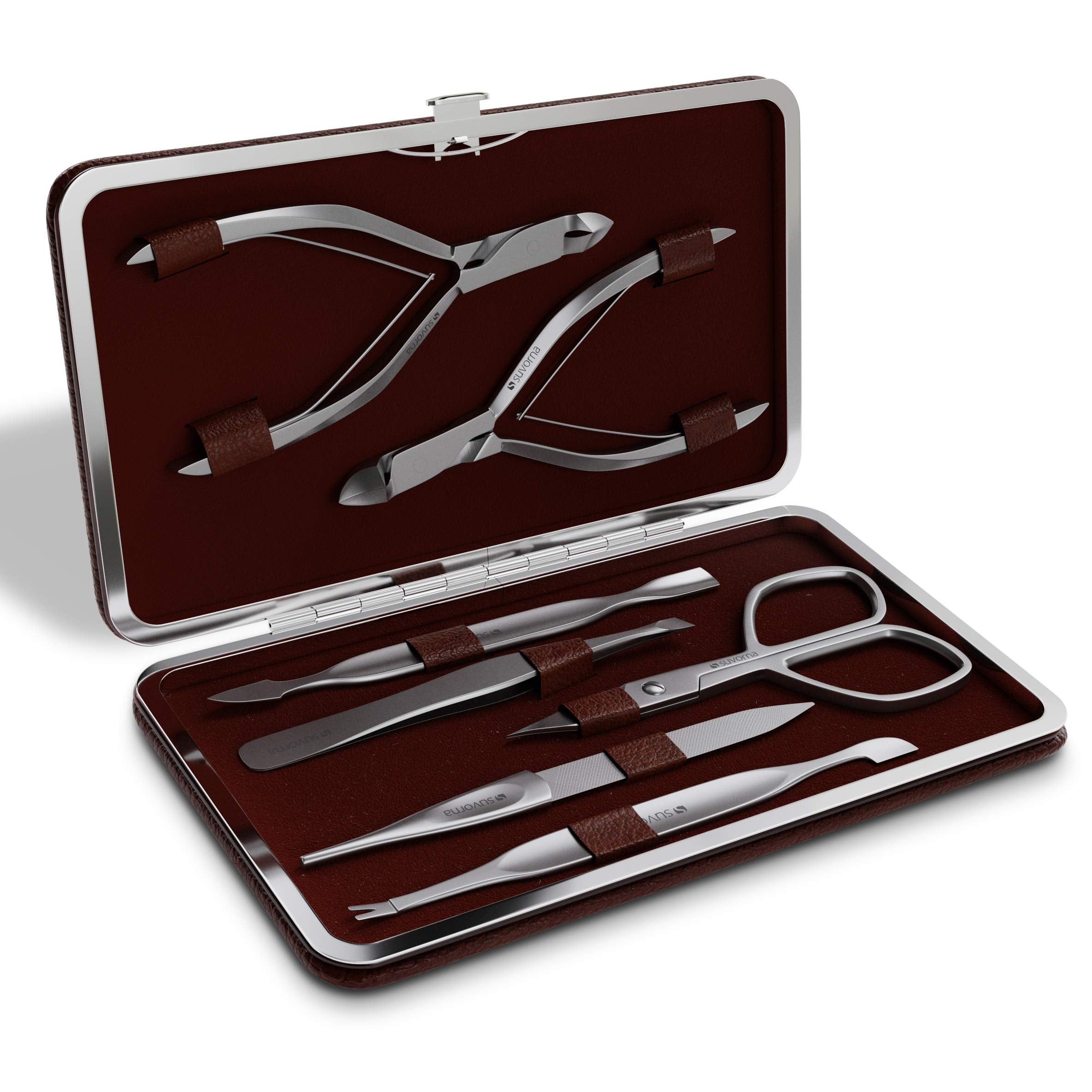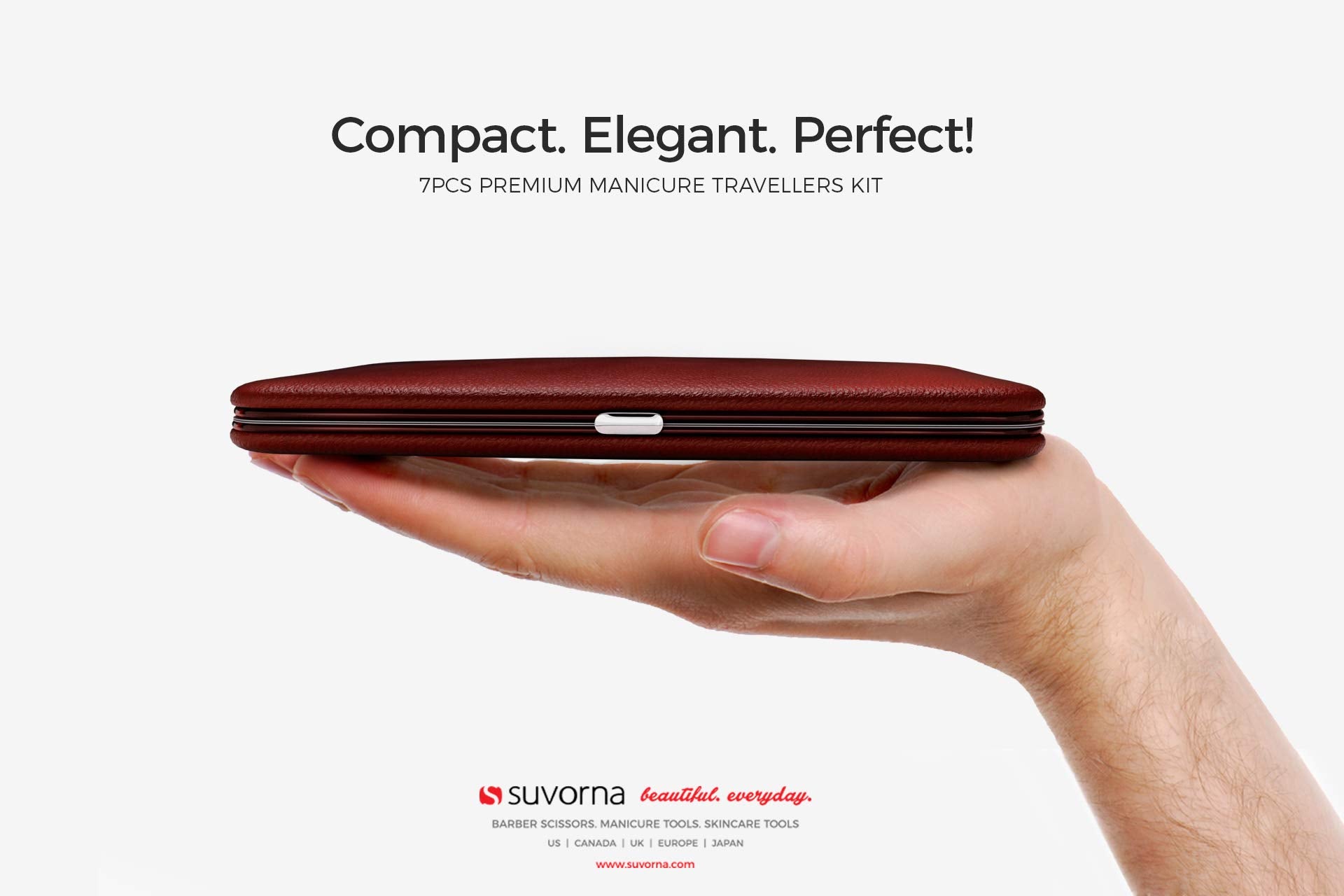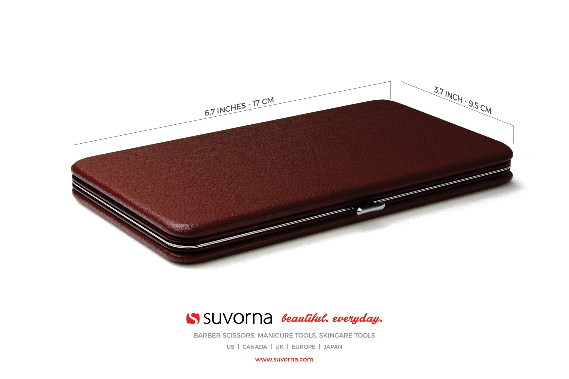 Spending too much money at the salon? Well, you're in luck, because Suvorna professional Japanese grade stainless steel top quality manicure kit can help you achieve salon-worthy results at the comfort of your home, at only a fraction of the cost. Professional-grade nail tools that will last for very long time. A manicure kit contains everything you need to shape & maintain your nails, trim the cuticles, clear away hanging nails & rough spots on your hands, & perfect the skin surrounding your nails. **Suvorna Professional Grade High-Quality Compact Manicure Kit.** 1\. Nail Nipper: 4.25" long nail nipper with high precision full jaw featuring curved blades. Double spring action with comfortable grip. Custom new design by suvorna. 2\. Cuticle Nipper: High quality 4.25” nail and cuticle nipper. Features high precision quarter jaw & durable lap joint, comes with comfortable double spring design. 3\. Nail Scissors: These newly design Suvorna Jetways 4" scissors have comfortable large finger rings. These nail cutting scissors have bigger blades then the cuticle scissors. 4\. Nail Cleaner:High-Quality Cleaner allows easy access to clean underneath and around nails. 5\. Cuticle Pusher & Cutter: High-Quality pusher for pushing and cutting cuticles. 6\. Nail Filer: Sturdy and lightweight nail filer with even cross ridges and a pointed end for nail cleaning. 7\. Slanted Tip Tweezers: Slanted wide tip tweezer is hand filed and features precision aligned sharp tips. With this manicure set, your hands & feet can always look their best without having to spend extra time or money at the salon. You'll be able to achieve your favourite nail designs from home, on your own time. A manicure kit is the perfect addition to any bathroom and can Serve as a great gift for any man or woman.