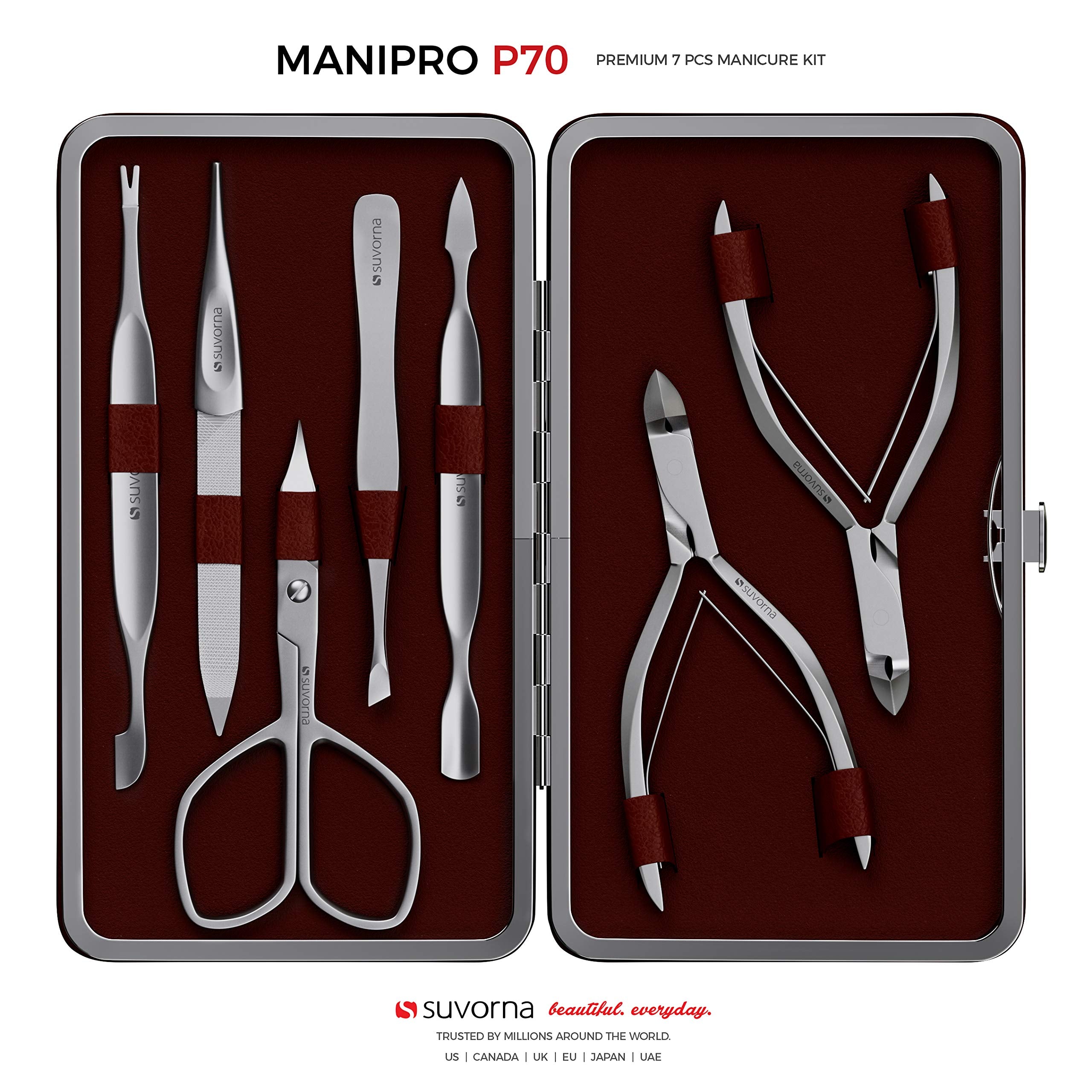 Suvorna manipro p70-7 Pcs Premium Manicure Set, (Nail & Cuticle Nippers, Nail Scissors, Pushers, Nail Filer, Tweezer). Professional Gift set. Comes in compact traveler case with.