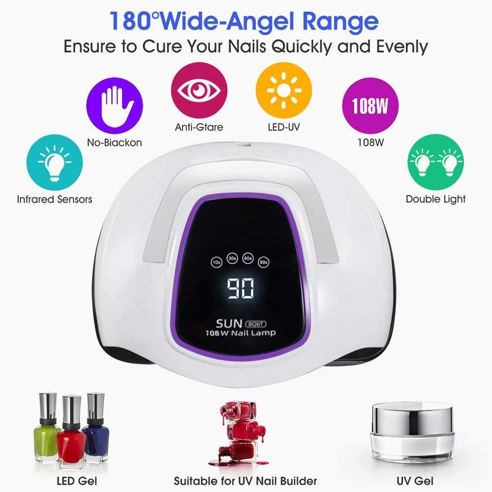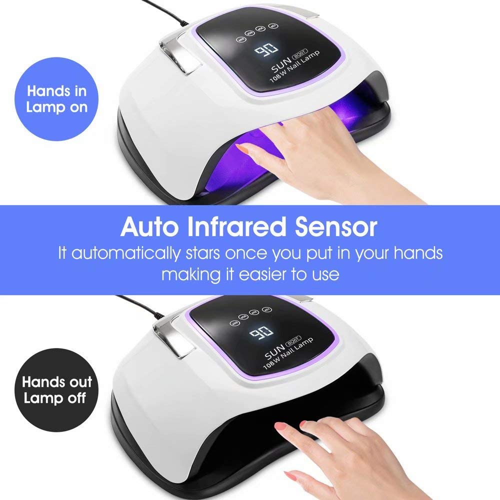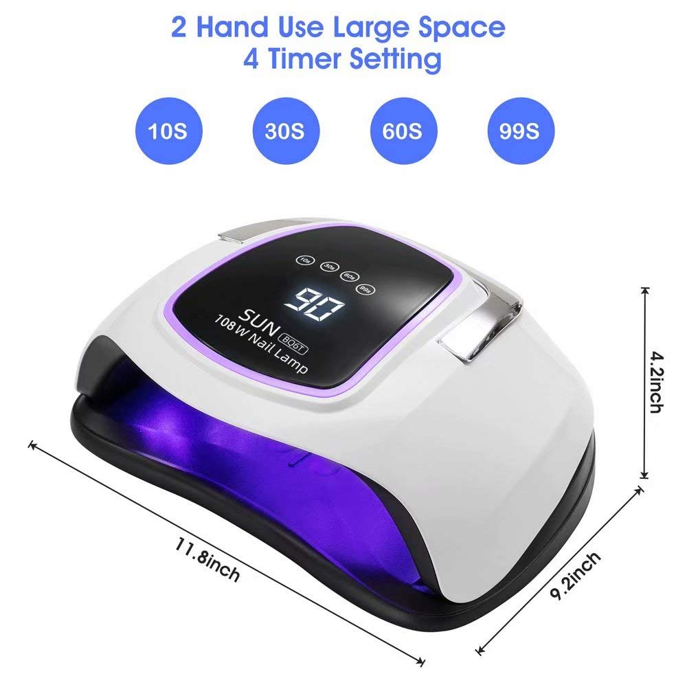 **Quick & Efficient Curing Lamp** **Big Space 2 Hand Use** Large enough to fit both hands or both feet inside at the same time! **Dual Power Option** 108W power led, you can switch freely in 2 seconds press, meet different demands, enjoy professional nail curing. **4 Timers Setting** Flexible Drying Options with 4 timer setting: 10s/30s/60s/99s low heat mode, also easy to use with a smart sensor **No Blacke Hand** Our LED nail lamp is safe for eyes. Say goodbye to outdated single UV lamps causing troubles with blackened hands and no harm for our eyes. Fashionable and durable 50000 hrs lifetime, ideal for both home and salon use. **How to Use** Step 1. Connect the power line socket (Ordinary charger, mobile power and computer supply) Step 2. Apply a thin layer of the BASE COAT, dry nail without touching the cuticle or skin alongside the nails. Step 3. Please use the appropriate timer (10S/30S/60S/99S) as per your requirements. The lamp will automatically shut off after the specified time. Step 4. After it had dry completely, apply COLOR COAT, and cure with the lamp at the absolute dried condition, to have an amazing and shiny color. Step 5. Please wipe your nails with a gentle cleanser or rubbing alcohol to get rid of the sticky residue left behind. **Specifications:** Power: 108W Input Power: 110-240V Screen Display: LCD display Time Setting: 10S/30S/60S/99S **Package Included** 1 x Nail lamp 1 x USB cable 1 x User manual