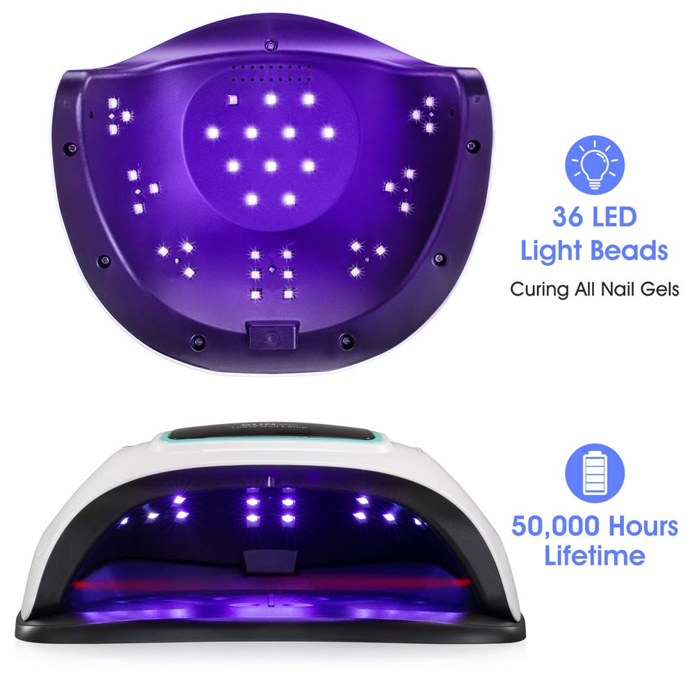 • Smart Sensor No Blacke Hand: Our LED nail lamp generate daylight non-ultraviolet white light safe for eyes. Say goodbye to outdated single UV lamps causing troubles with blackened hands and no harm for our eyes. Fashionable and durable 50000 hrs lifetime, ideal for both home and salon use. Our professional fingernail and toenail LED nail lamp has infra-red sensors that automatically turn on or off the gel nail light when you slide your hand or foot in and out.