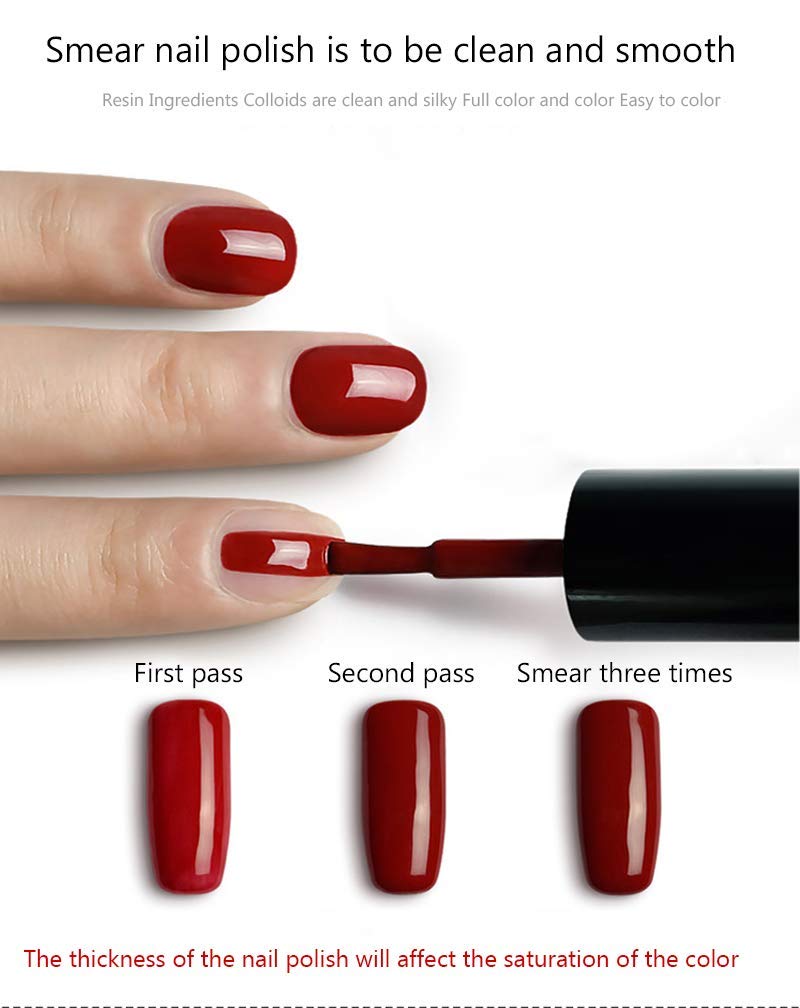 Features · 24 Popular & Trendy Color Gel Polish (Requires Top & Base Coat - No included) · 9 Toxin Free formula, easy and safe to apply. · Long lasting for 21+ days with perfect shine. Certification · Produced by GMP factory (Good Manufacturing Practice). · Passed SGS test of Heavy metal and Toxicological risk assessment. · SDS provided. Application Process: 1\. Preparation: Trim, file and buff nails for a clean and dry surface. * Before opening the bottle, roll the bottle between your hands back and forth to gently mix. 2\. Base Coat: Apply thin base coat, cure under UV/LED lamp for 60-90 seconds. 3\. Gel polish: Apply first thin layer of color gel polish and cure under UV/LED lamp for 90-120 seconds. Apply the second or third layer color gel polish. * When applying color, wipe excess gel with brush before applying strokes. 4\. Top Coat: Finish off with a layer of top coat, cure under UV/LED lamp for 90-120 seconds. * Applying every thin coat is the key * Tips to avoid chipping: 1\. Before applying, please ensure your nails are completely dry, clean and oil-free. 2\. Don't apply gel on the skin or cuticle. 3\. Apply gel to the edge of each nail to seal the gel with the brush horizontally to avoid chipping. Removal Process: 1\. Lightly buff off the shine from the top of nails using a nail buffer. 2\. Soak a cotton ball or pad with nail gel remover and place on top of each nail. 3\. Wrap the nail with aluminum foil or any nail wrap to secure and allow the remover to soak. 4\. Soak for a minimum of 15 minutes. 5\. Remove cotton and foils one at a time and gently push off gel using a removal wand. Gel should come off easily without much effort. If necessary, re-saturate cotton and rewrap finger and soak for 5 more minutes. 6\. Lightly buff nails again once all gel is removed.
